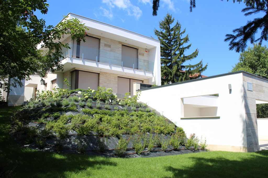 A tervezés során 3 szintes, tetőteraszos, elegáns, luxus családi házat álmodott meg a tervező. A földszinten amerikaikonyhás nappali valamit egy saját fürdőszobával rendelkező szoba, míg az emeleten további hálószobák, illetve dolgozó kerül kialakításra. A pinceszinten akár 3 autó befogadására alkalmas teremgarázs és kiszolgáló helyiségek kapnak helyet, a tetőteraszon pedig szauna és jacuzzi kerül megvalósításra. A saroktelek adta lehetőséget kihasználva, az épületet teljesen körül járja a nap, biztosítva a belső terek természetes világosságát.